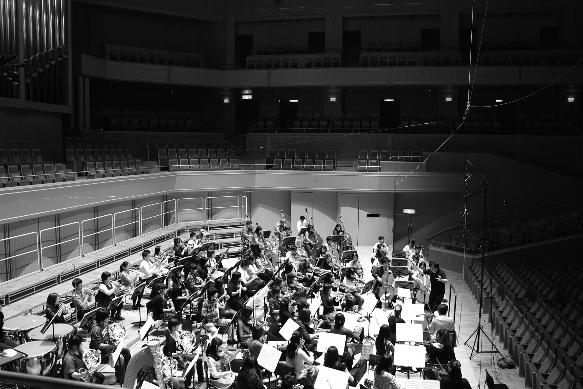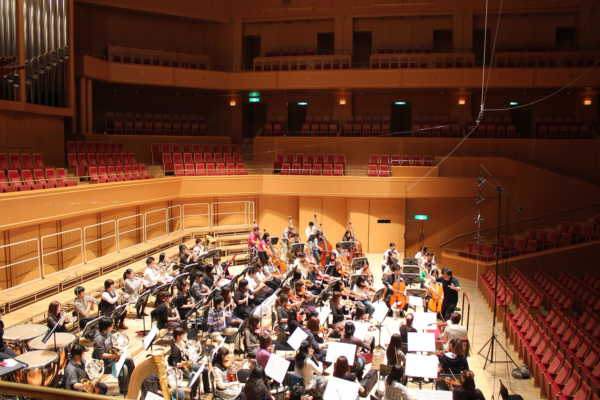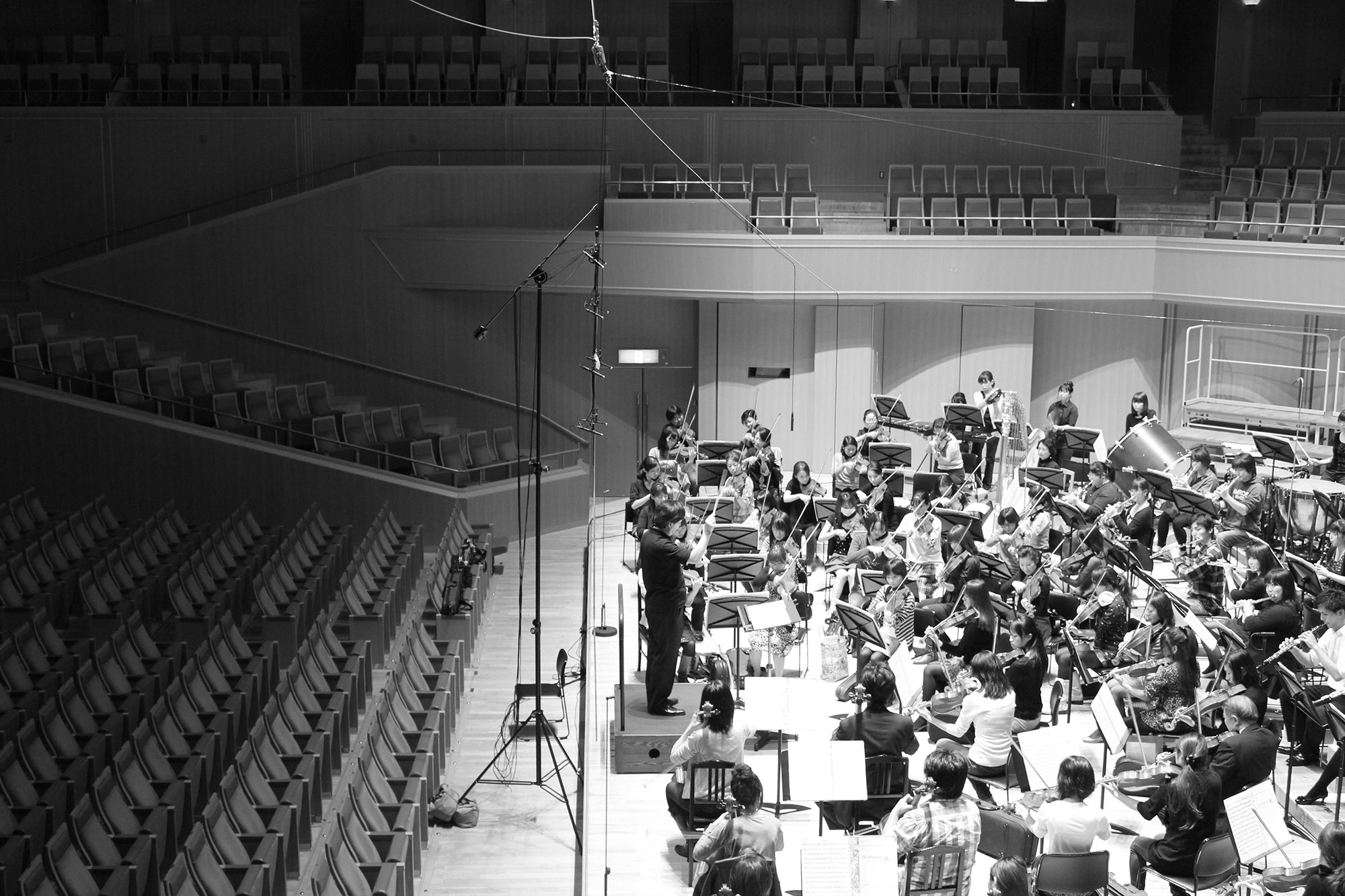 To compare the height of the best main microphone position in the orchestra recording.In a rehearsal of Nagoya University Of Arts Orchestra's Annual concert at the Aichi Prefecture Art Center's Concert Hall on October 28, 2010, Playing Tchaikovsky's,Capriccio Italien, Op. 45 and Beethoven's Symphony No. 9 in D minor op.125. The main microphone DPA 4006 was set up at 4 points with different heights. Recorded by Studer 962, Magix Sequoia 88.2kHz 24bit. Please click the following photo.You can listen it. Sound format is 44.1kHz mp3 320kbps. |