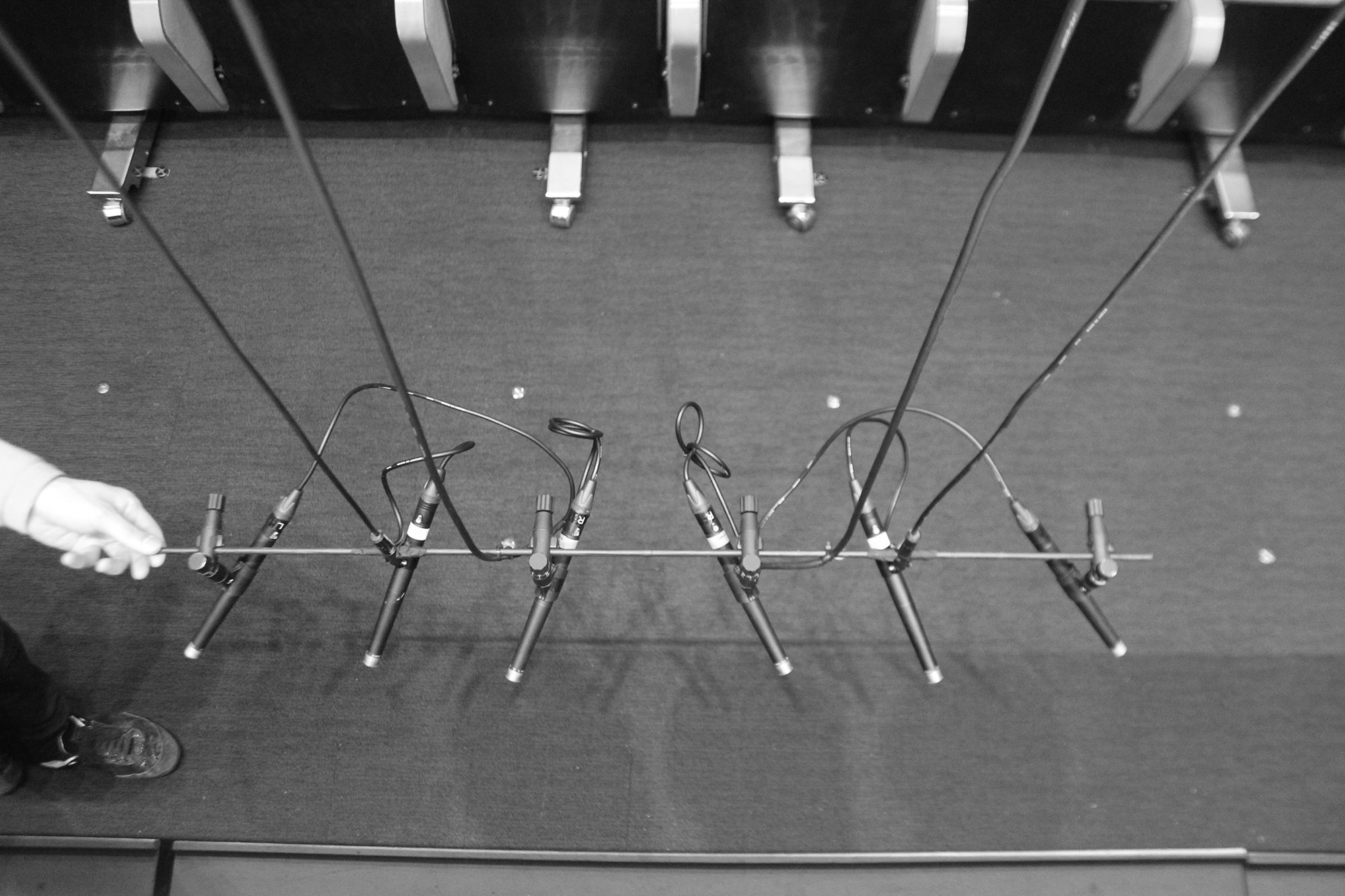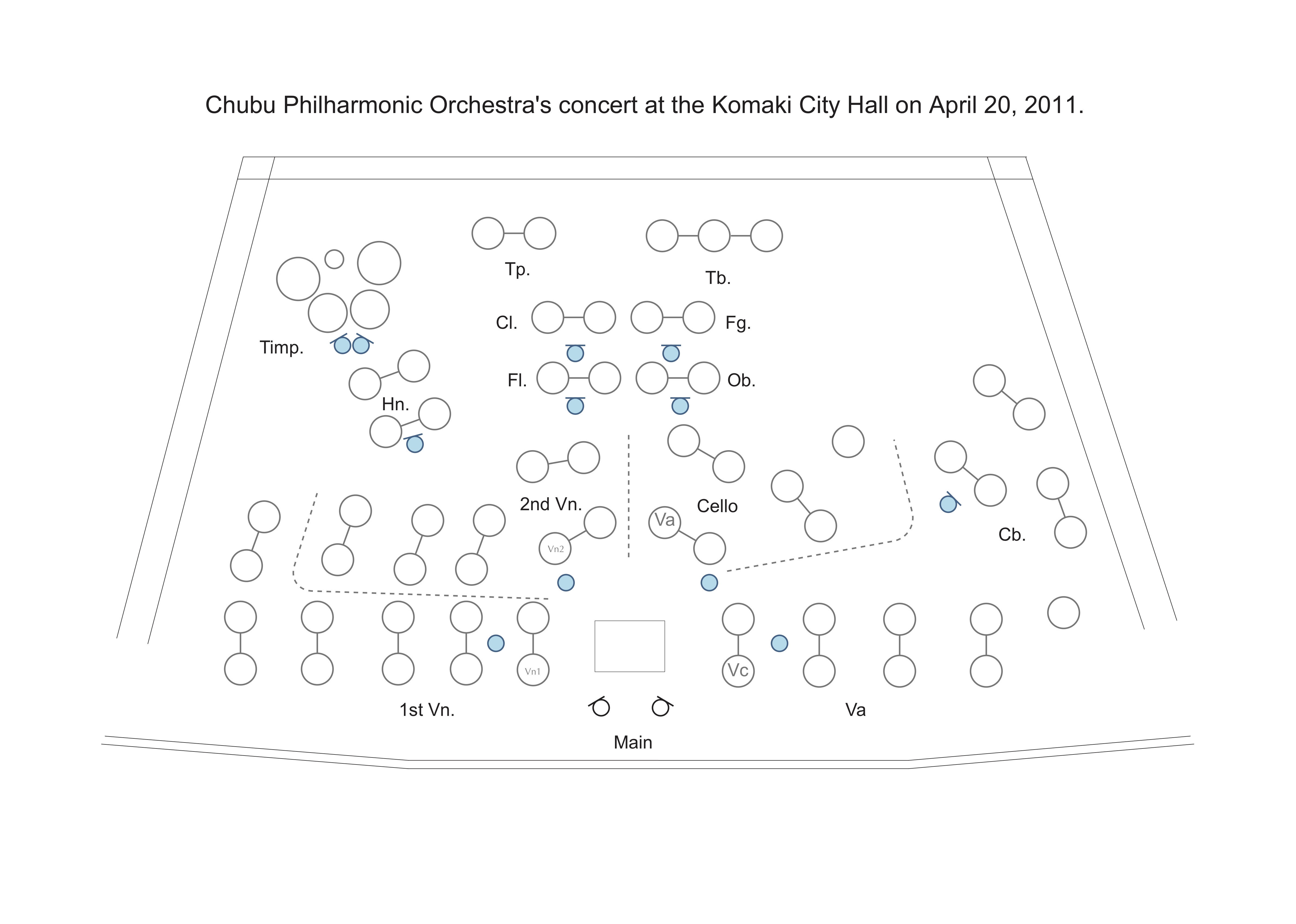 To compare the best main microphone position in the orchestra recording. In a rehearsal of Chubu Philharmonic Orchestra's concert at the Komaki City Hall on April 20 2011., playing Brahms's Symphony No. 1 in C minor, Op. 68. The main microphone DPA 4006 was set up at 3 points with different spacing between A-B microphones.Recorded by Studer 962, Magix Sequoia, 88.2kHz 24bit. Recorded by Studer 962, Magix Sequoia and Tascam Recorder 88.2kHz 24bit.Please click the following photo.You can listen it. Sound format is 44.1kHz mp3 320kbps. |