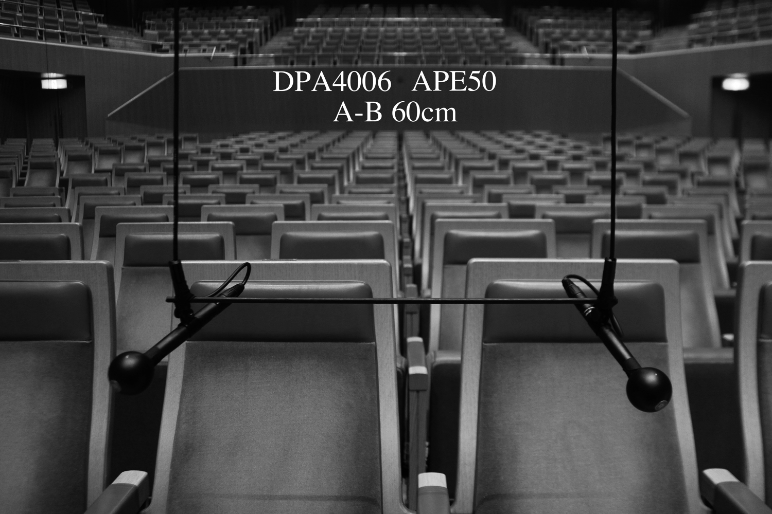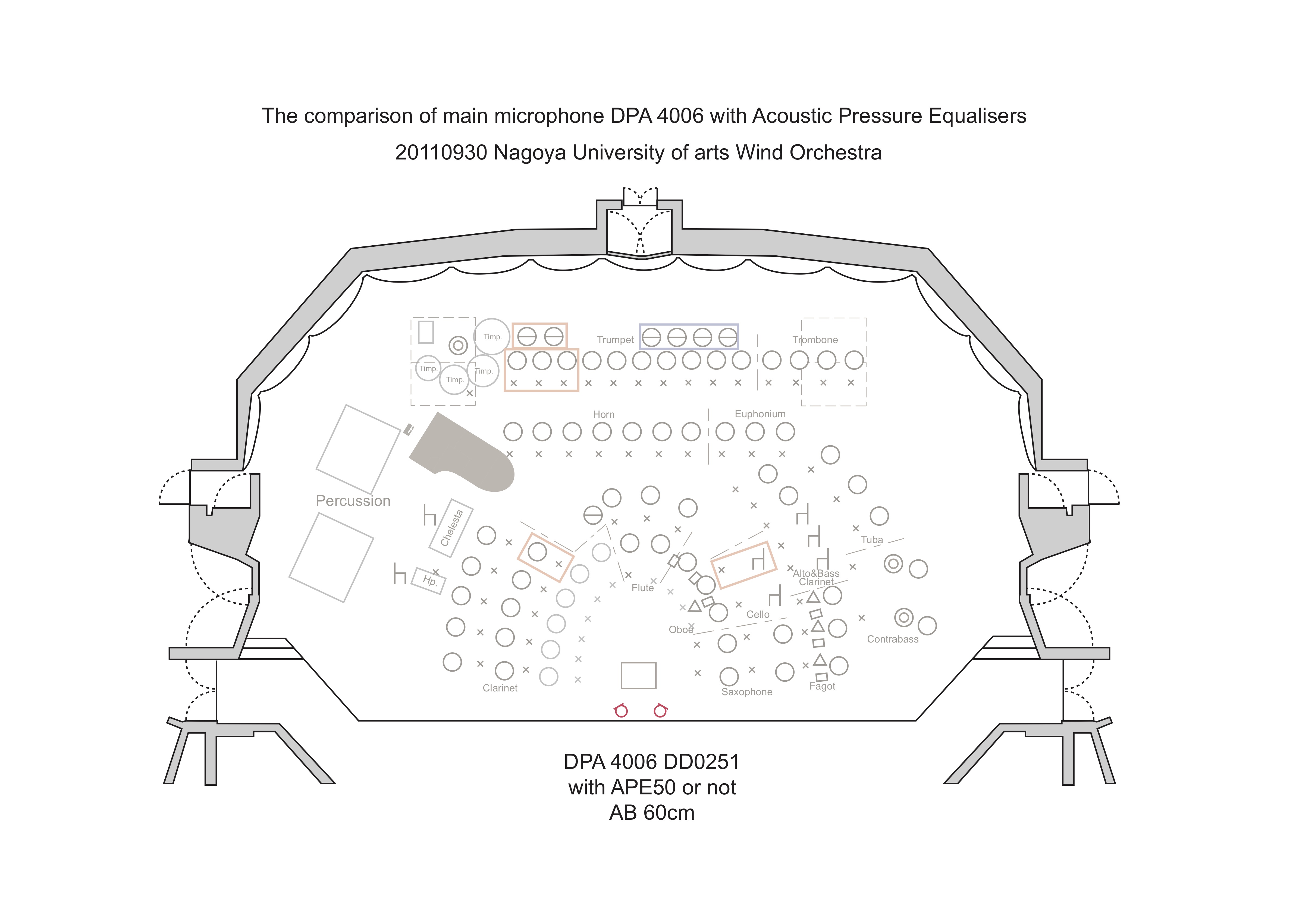 To compare the DPA 4006 attached with Acoustic Pressure Equaliser APE50(50 mm ball) or not attach. How many level boost mid-high frequency and How change high frequencies focus directionality. In a live recording of Nagoya University of arts Wind Orchestra at the Aichi Prefecture Art Center's Concert Hall on September 30, 2011. Recorded by Studer 962, Magix Sequoia 88.2kHz 24bit. Click the following photo.You can listen it. Sound format is 44.1kHz mp3 320kbps.
